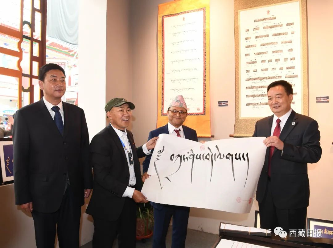 這是中國(guó)西藏旅游文化國(guó)際博覽會(huì)期間,王君正向尼泊爾聯(lián)邦院主席加內(nèi)什·普拉薩德·蒂米爾西納贈(zèng)送藏文書(shū)法作品。記者 李洲 攝
