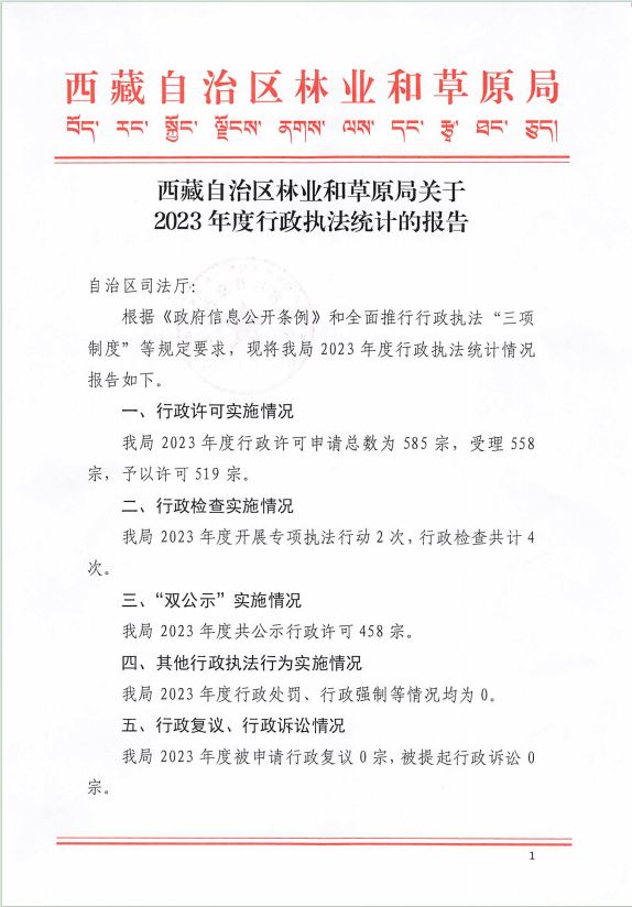 西藏自治區(qū)林業(yè)和草原局關(guān)于2023年度行政執(zhí)法統(tǒng)計的報告