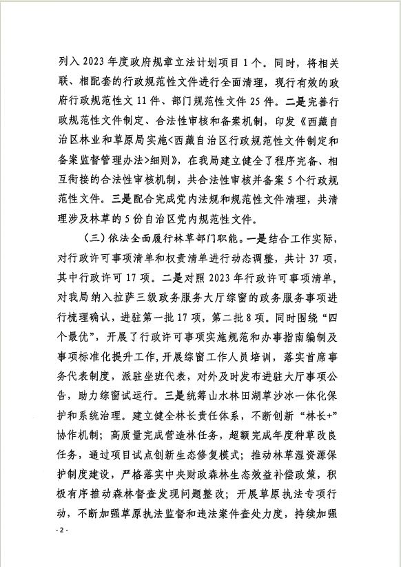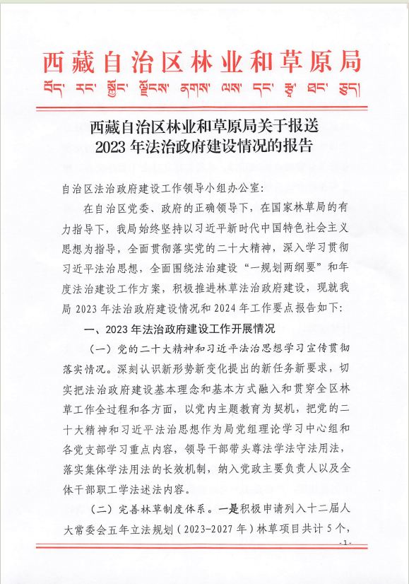 西藏自治區(qū)林業(yè)和草原局關(guān)于報送2023年法治政府建設(shè)情況的報告