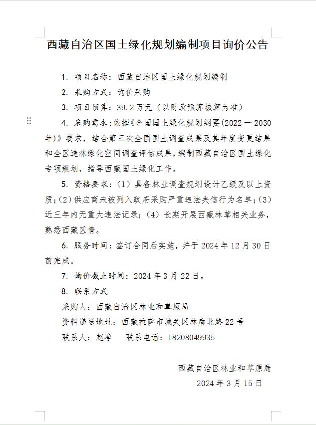 西藏自治區(qū)國(guó)土綠化規(guī)劃編制項(xiàng)目詢價(jià)公告