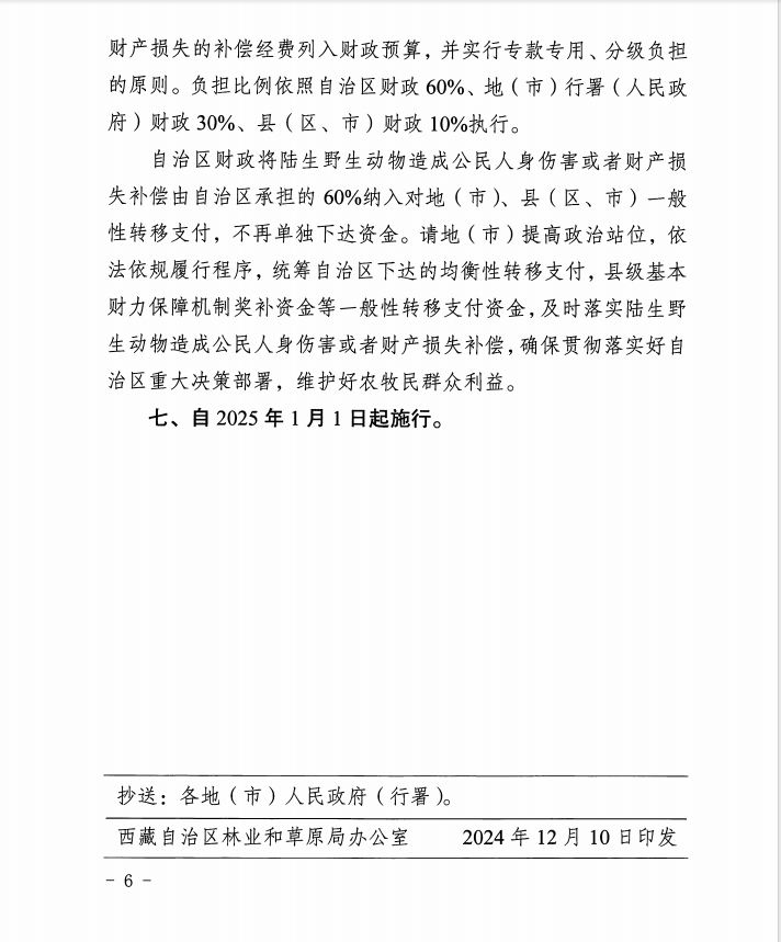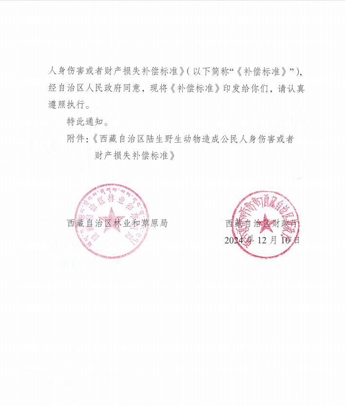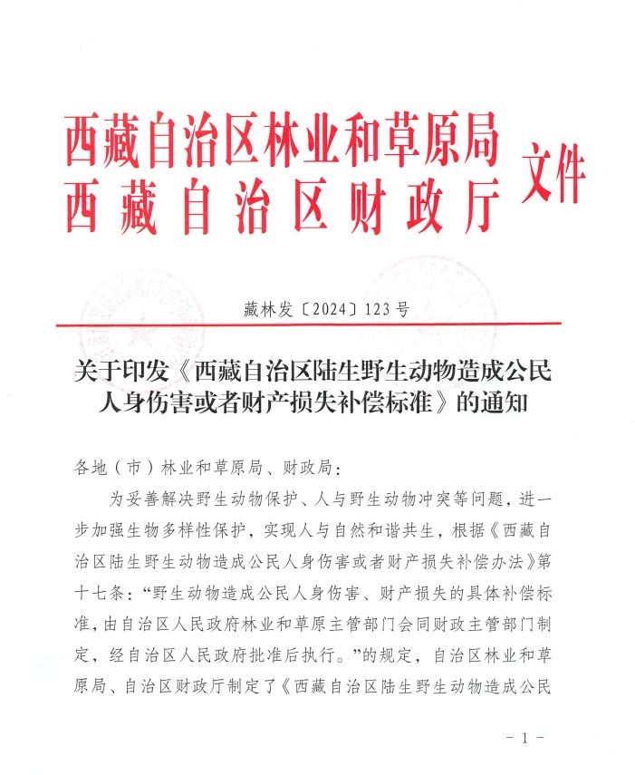 關(guān)于印發(fā)《西藏自治區(qū)陸生野生動(dòng)物造成公民人身傷害或者財(cái)產(chǎn)損失補(bǔ)償標(biāo)準(zhǔn)》的通知