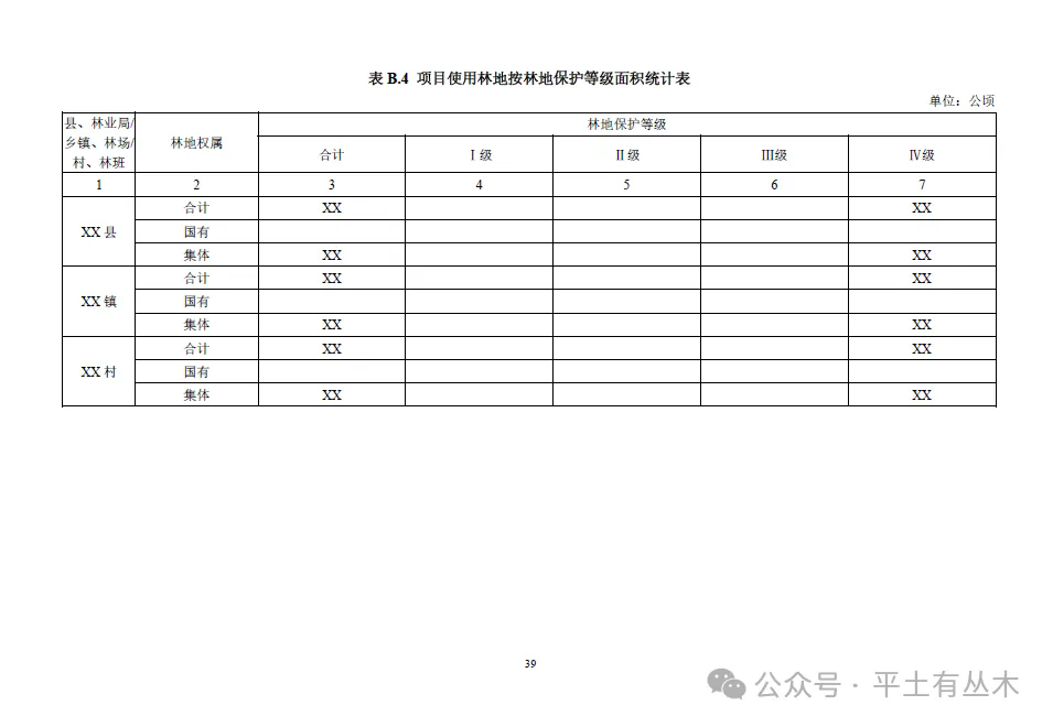建設項目使用林地審核審批中的附表—表B.4項目使用林地按林地保護等級面積統(tǒng)計表,就是根據小班表(項目用地紅線與林地數據相交后的數據并已編制小班號)中的保護等級字段來填寫。表B.4的使用林地權屬填寫縣(區(qū))、鄉(xiāng)(鎮(zhèn))、村(社區(qū))即可,同樣的,不論是縣(區(qū))、鄉(xiāng)(鎮(zhèn))、村(社區(qū))都需要根據建設項目使用林地的林地權屬(國有/集體)來填寫,完成填寫建設項目使用縣(區(qū))、鄉(xiāng)(鎮(zhèn))、村(社區(qū))林地的小計,最終再根據建設項目使用林地林地保護等級、林地權屬的面積進行合計。