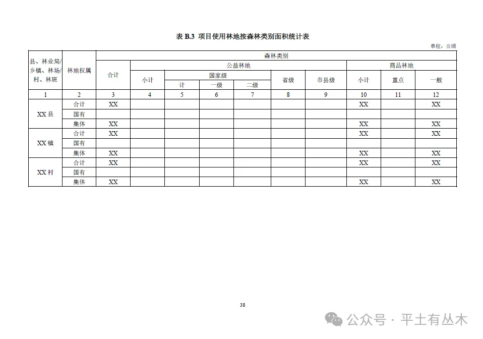 在Arcgis中,項目用地紅線范圍與林地數據相交之后的數據是填寫林地可研的各個附表的依據。其中表A.1建設項目使用林地因子調查表已經在建設項目使用林地現狀調查表——如何填寫A.1建設項目使用林地因子調查表這期文章中有講述。表B.1項目使用林地按使用林地類型面積蓄積統(tǒng)計表填寫時最小的單位是村(社區(qū)),依次為鎮(zhèn)、縣,每個單位均需要依據權屬性質填寫,村(社區(qū))、鎮(zhèn)和縣均需要小計項目區(qū)使用林地國有和集體性質的林地面積。表B.1項目使用林地按使用林地類型面積蓄積統(tǒng)計表建設項目使用林地審核審批中的附表—表B.2 項目使用林地按地類面積統(tǒng)計表,就是根據小班表(項目用地紅線與林地數據相交后的數據并已編制小班號)中的di_lei字段來填寫(是否涉及地類認定追溯問題看往期文章建設項目使用林地——與2022年林草濕資源“一張圖”數據不一致描述示范來判斷)。表B.3項目使用林地按森林類別面積統(tǒng)計表中有公益林地和商品林地,根據小班表(項目用地紅線與林地數據相交后的數據并已編制小班號)中的森林類別字段來填寫。表B.3的使用林地權屬填寫縣(區(qū))、鄉(xiāng)(鎮(zhèn))、村(社區(qū))即可,同樣的,不論是縣(區(qū))、鄉(xiāng)(鎮(zhèn))、村(社區(qū))都需要根據建設項目使用林地的林地權屬(國有/集體)來填寫,完成填寫建設項目使用縣(區(qū))、鄉(xiāng)(鎮(zhèn))、村(社區(qū))林地的小計,最終再根據建設項目使用林地森林類別、林地權屬的面積進行合計。