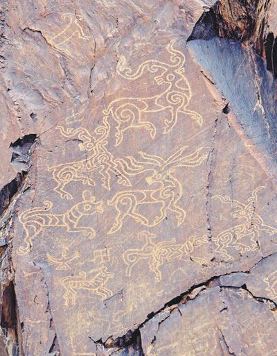 羌塘草原遠(yuǎn)古巖畫(huà)中的動(dòng)物圖案。記者 鄧建勝攝