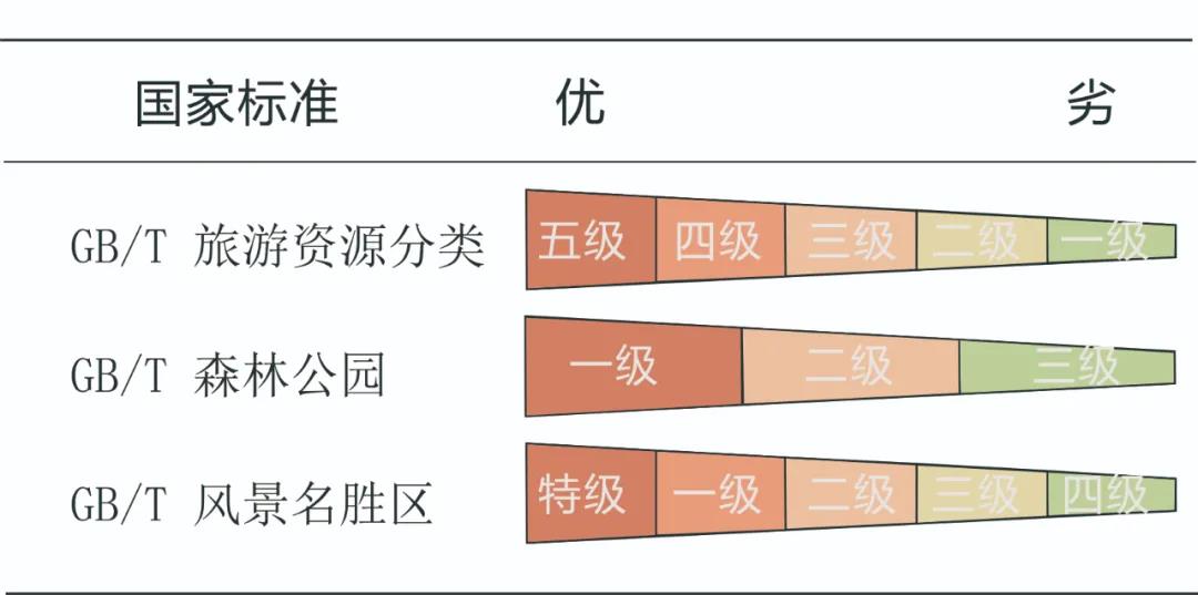 △不同國(guó)標(biāo)對(duì)旅游資源(風(fēng)景資源、景源)的分級(jí)與表述