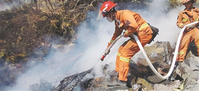 4月5日凌晨4時,隊伍在熟悉當?shù)氐匦蔚南驅(qū)ьI下,沿著陡峭的羊腸小道像巖羊一樣在山石間攀緣前進。到達山頂后,隊員們采取多點突破分段阻擊的戰(zhàn)術,沿火線邊挖隔離帶邊清理邊緣火。分段作業(yè)完成后,隊員們開始清理跡地余火,當日,火場就被控制下來,第二天便轉(zhuǎn)入清理值守階段。4月7日,隊員們拖著疲憊的身軀回到營區(qū)。