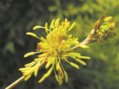 性狀特征:銀縷梅是金縷梅科銀縷梅屬落葉小喬木,樹(shù)態(tài)婆娑,枝葉繁茂;葉片為薄革質(zhì),呈倒卵形,基部圓形或微心形,兩面被星狀毛,邊緣具鈍鋸齒;先花后葉,頭狀花序,花瓣條形,花淡綠,綠后轉(zhuǎn)白,花朵先朝上,盛花后下垂,遠(yuǎn)看滿樹(shù)金黃;蒴果近圓形,密生絨毛;種子紡錘形,兩端尖,褐色有光澤;3—5月開(kāi)花,9—10月結(jié)果。