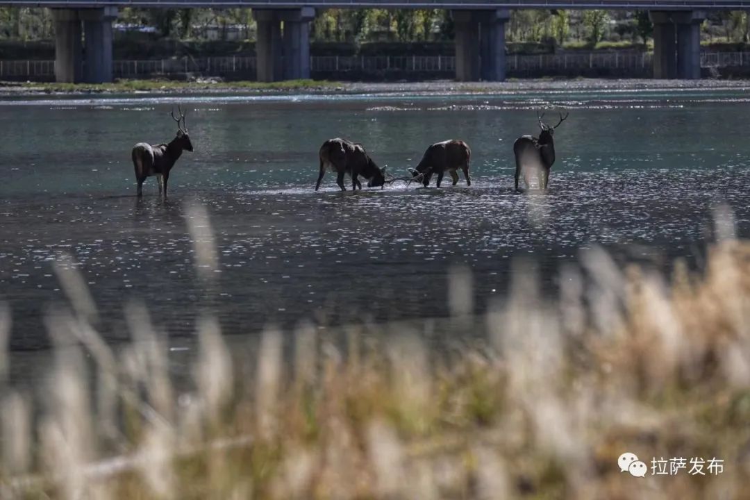 近日,在拉薩市濱河路附近,幾只白唇鹿在拉薩河畔覓食、散步,甚至跳入河里游泳,好不自在。一旁的水鳥撲騰著翅膀,似乎在歡迎著它們的到來,構(gòu)成一幅拉薩生態(tài)畫卷。快看!一波高清大圖來襲……