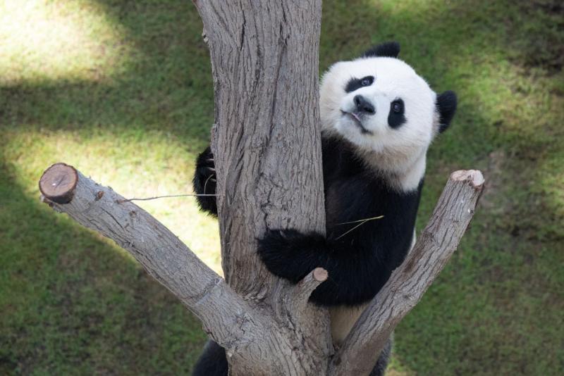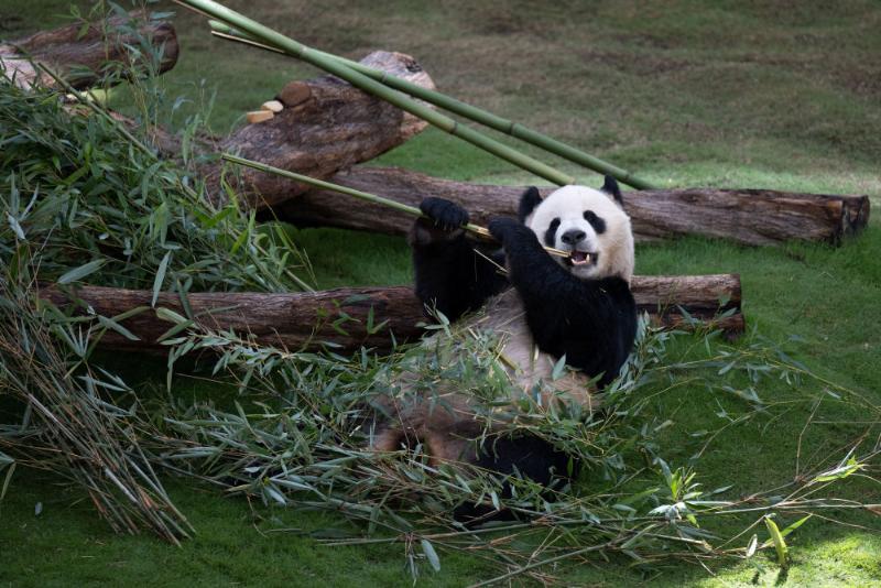 當(dāng)天在豪爾熊貓館,記者看到,兩只熊貓都有自己專屬的生活區(qū),空調(diào)恒溫,涼爽舒適,“京京”一直在吃新鮮的竹子,“四海”則更鐘愛(ài)爬樹。